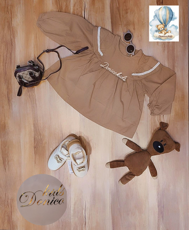 شومیز دخترونه قهوه ای روشن مدل فون یقه گرد و سرشانه های برجسته و خامه دوزی جنس شومیز لینن با کیفیت مناسب ۲ تا ۸ سال و فصل بهار و عید و مهمونی و بیرون و....