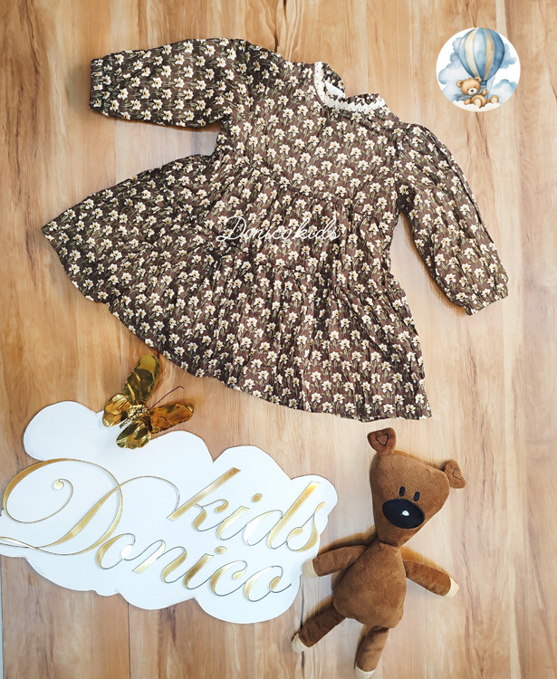 پیراهن دخترانه گل گلی با رنگ زمینه قهوه ای و گل های ریز کرم یقه گرد با نوار گیپوری پشت زیپ دار و سر آستین ها کشی مدل فون از زیر سینه گشاد میشه برا سن ۳ تا ۸ سال مناسبه سایزبندی ۹۰_۱۳۰