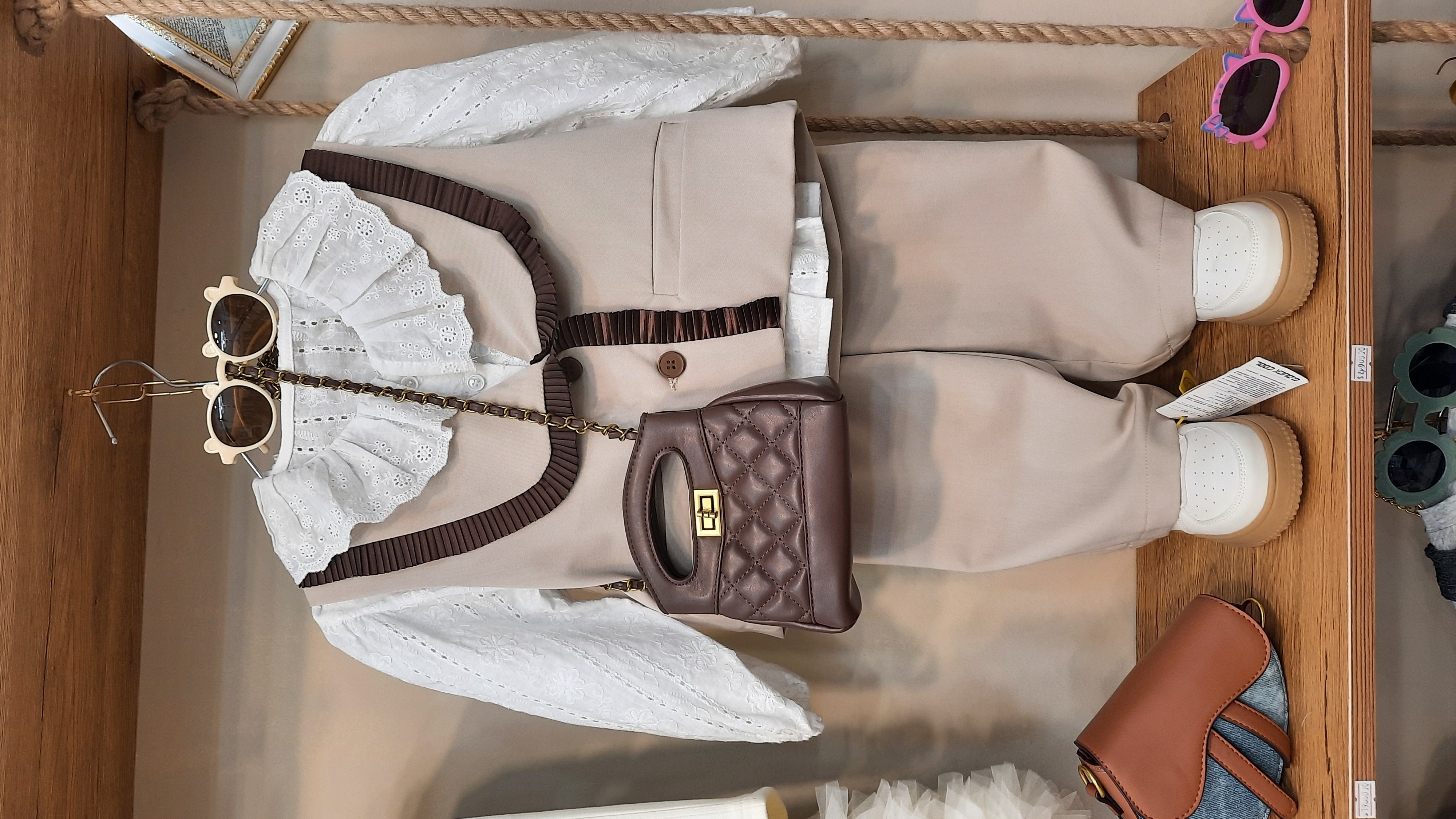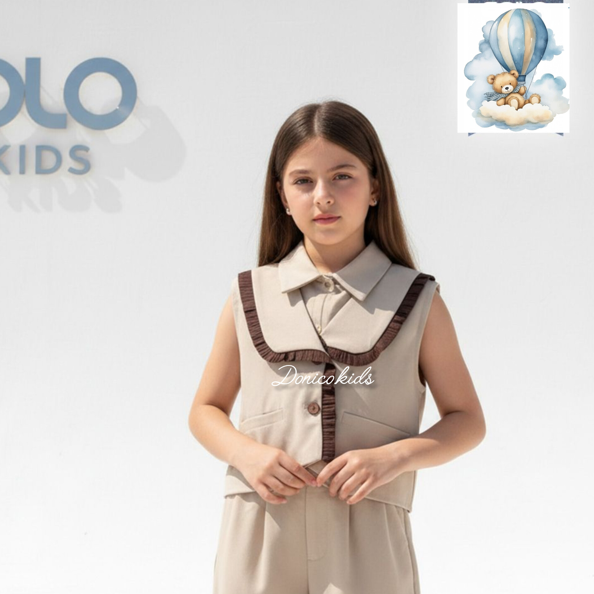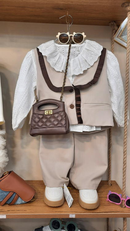 ست دو تیکه دخترونه شامل وست یقه امریکایی با نوار پلیسه براق قهوه ای دو تا جیب مخفی و دکمه فانتزی داره کوتاه و کراپ ماننده شلوارش واید لگ راسته با کمر پشت کش و جلو صاف و مجلسی کوتاه جنس پارچه کرپ مات با کیفیت بسیار خوش فرم و زیبا مناسب بهار عید مهمونی قابل ست با شومیز مناسب ۲ تا ۷ سال