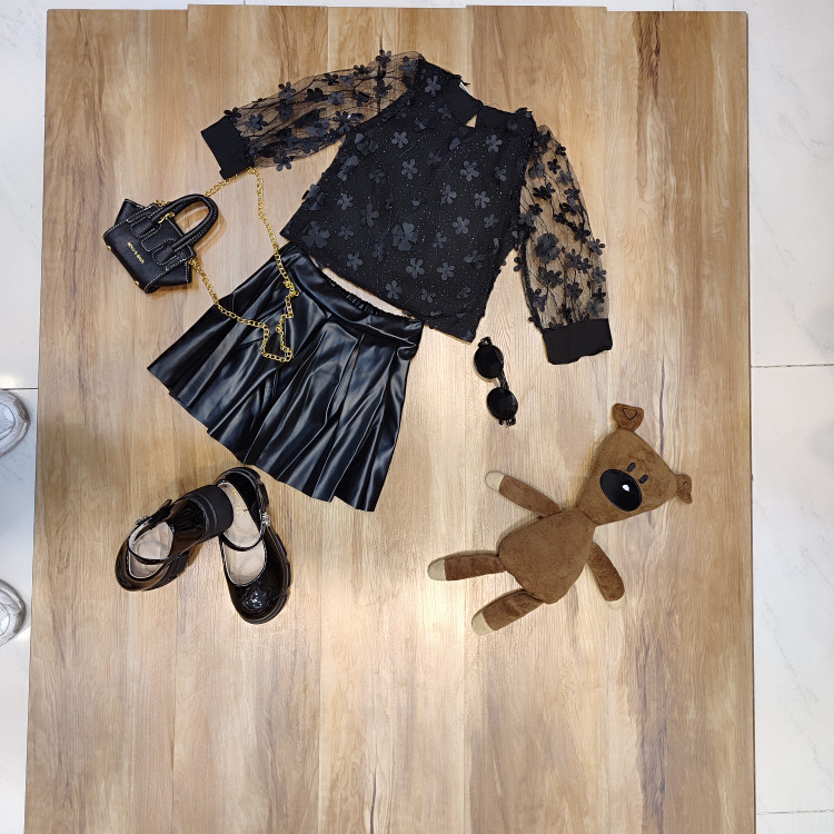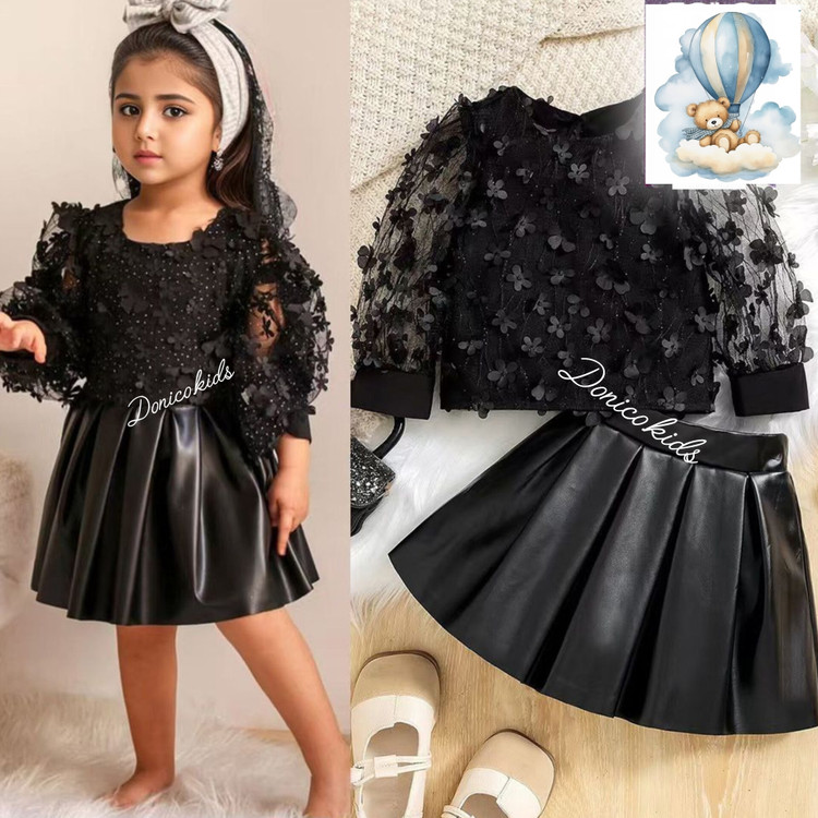 ست دو تیکه دخترونه مجلسی شامل بلوز توری با گل های برجسته در کل کار و بدنه بلوز آستر نخی داره و دامن چرمی کوتاه پشت کمر کش جلوش صاف و مجلسی، رنگ مشکی، مناسب مهمونی و مراسمات متنوع خیلی شیک و فانتزی برا رده سنی ۲ تا ۸ سال مناسبه