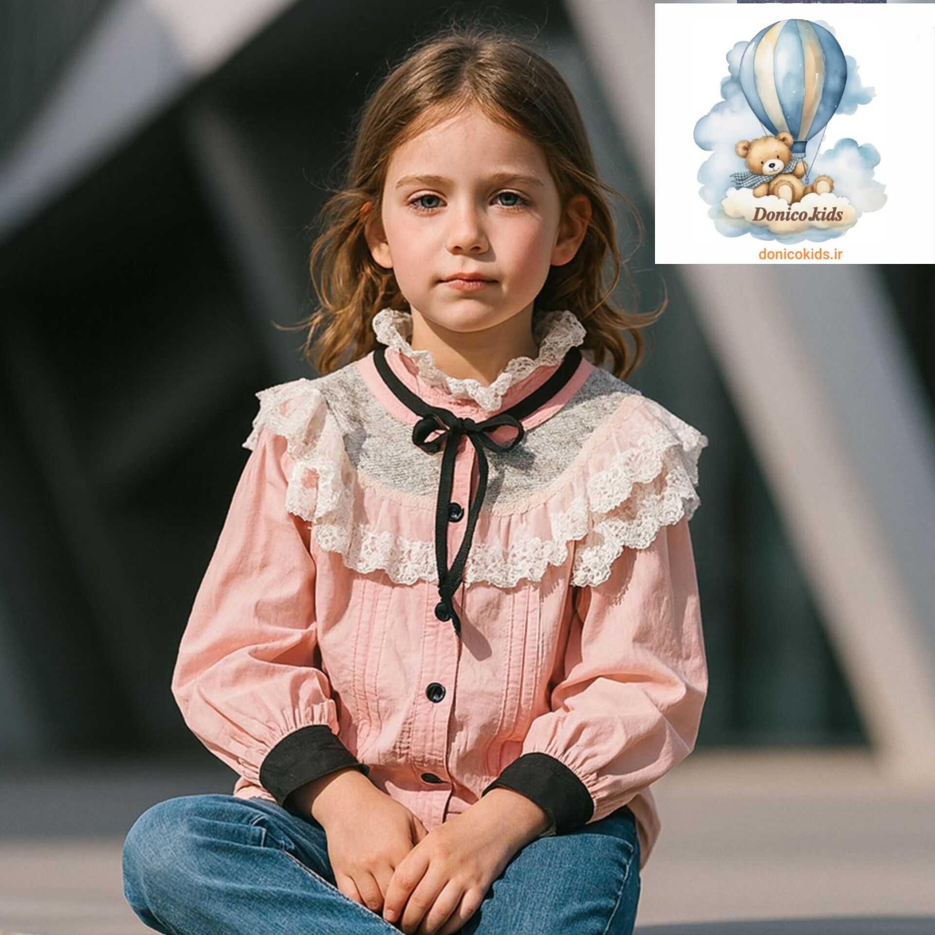 شومیز مجلسی فانتزی دخترونه مدل انگلیسی با یقه ایستاده توری سفید و نوار روبان مشکی ریبا و سر آستین های دکمه دار مشکی جلو شومیز تمام دکمه جنس نخی تک رنگ صورتی ملیح و روشن بسیار خوش دوخت و ریبا برا دخترای زیبا مناسب بهار و تابستان برا سنین ۳ تا ۸ سال مناسبه