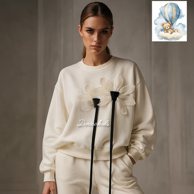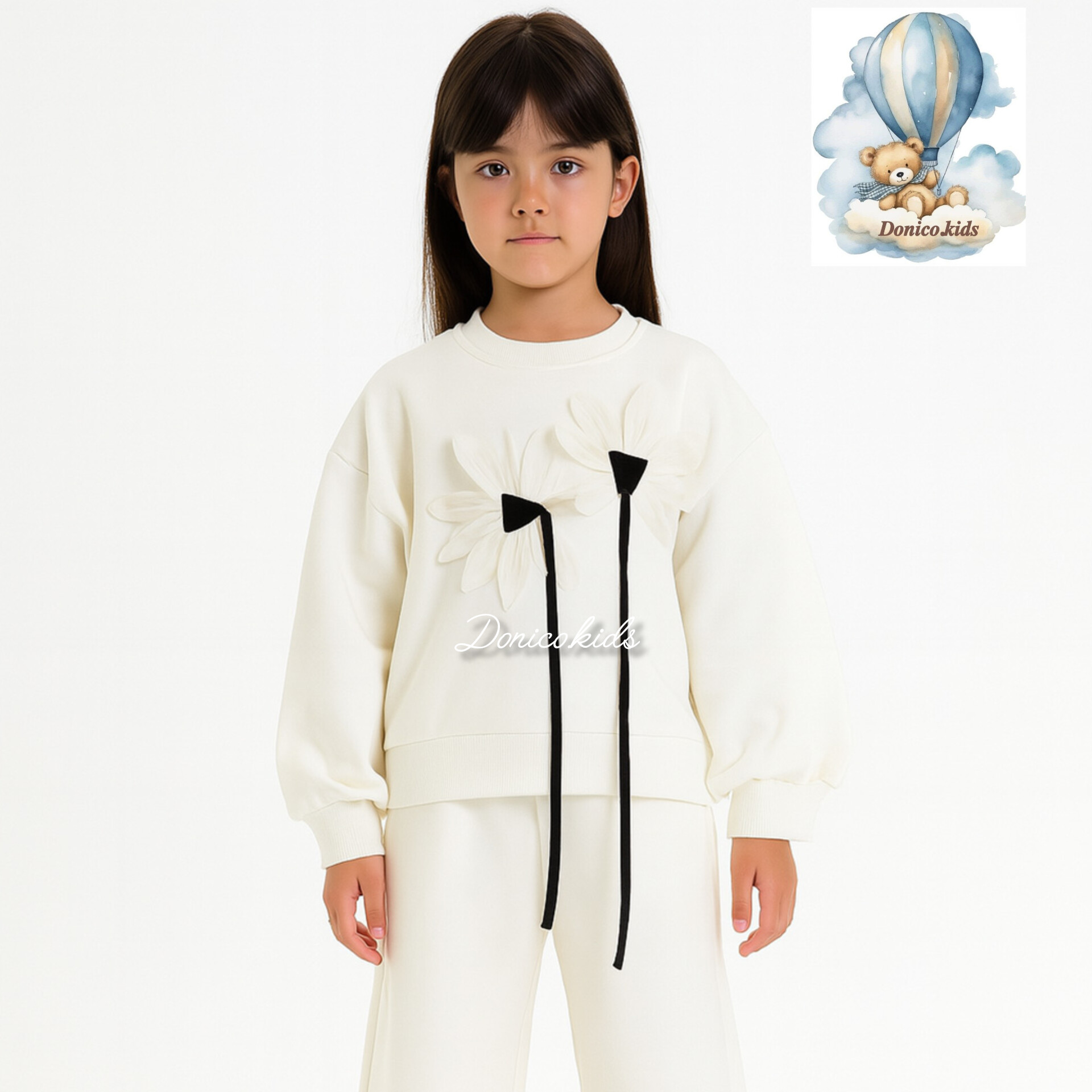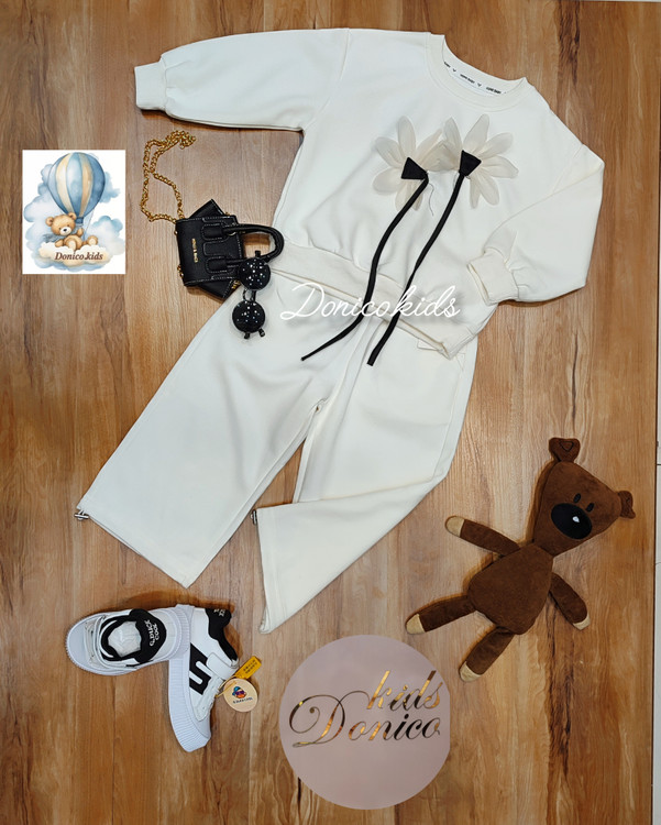 ست دو تیکه ادایی مجلسی دخترونه شامل دورس و شلوار نیم بگ مدل دورس یقه گرد ساده با طرح برجسته گل توری و روبان مشکی جنس نخ پنبه با کیفیت عالی رنگ سفید شیری مدل شلوار نیم بگ با کمر کشی مناسب بهار و دختران سنین ۳ تا ۸ سال